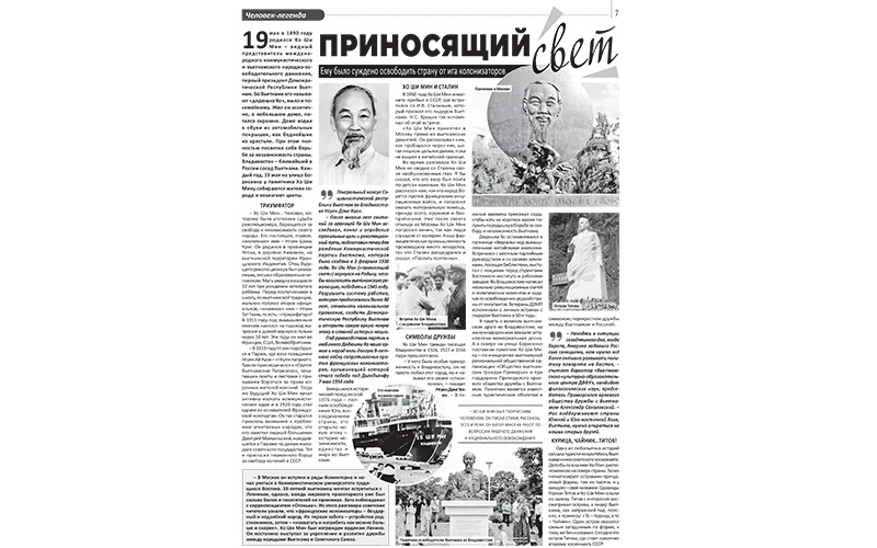 Để tưởng nhớ người đồng chí Việt Nam vĩ đại ở Vladivostok, tại nhà ga xe lửa đã đặt tấm bảng kỷ niệm. Trong công viên trên phố Borisenko, tượng Hồ Chí Minh được dựng lên, theo sáng kiến của “Hội người Việt tại vùng Primorye” và sự ủng hộ của Hội hữu nghị vùng Primorye với Việt Nam. Tượng đài trở thành địa điểm thu hút khách du lịch và là biểu tượng của tình hữu nghị Việt-Nga. Ngoài ra, bài viết cũng kể câu chuyện về tượng đài nhà du hành vũ trụ Liên Xô Gherman Titov trên đảo Titov ở Vịnh Hạ Long của Việt Nam.