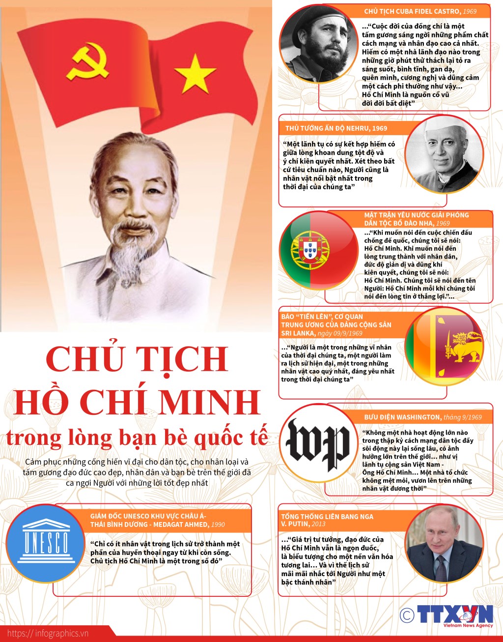 Đối với nhân dân và bạn bè trên thế giới, Chủ tịch Hồ Chí Minh là lãnh tụ kiệt xuất, người chiến sĩ cộng sản lỗi lạc, người đồng chí, người thầy kính yêu, người bạn thân thiết. Cảm phục những cống hiến vĩ đại cho dân tộc, cho nhân loại và tấm gương đạo đức cao đẹp, nhân dân và bạn bè trên thế giới đã ca ngợi Người với những lời tốt đẹp nhất.