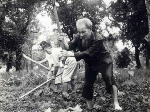 Bác Hồ cuốc đất, trồng rau trong vườn Phủ Chủ tịch năm 1957. (Ảnh tư liệu TTXVN)