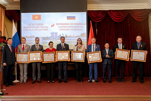 Lễ kỷ niệm 50 năm giữ gìn thi hài Chủ tịch Hồ Chí Minh và trao huân chương, huy chương tặng các tập thể, chuyên gia Nga tại Đại sứ quán Việt Nam ở Liên bang Nga. Ảnh: Trang web Đại sứ quán Việt Nam tại Liên bang Nga