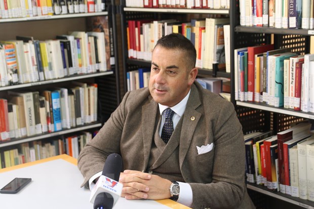 Thị trưởng thành phố Todi Antonio Ruggiano trả lời phỏng vấn phóng viên TTXVN tại Rome về việc thành lập thư viện về Chủ tịch Hồ Chí Minh. (Ảnh: Thanh Hải, Trường Dụy/TTXVN)