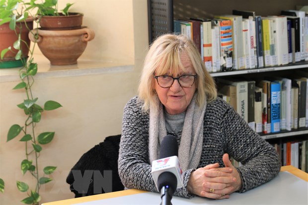 Chủ tịch Hiệp hội văn hóa Pegaso Deana Mannaioli trả lời phỏng vấn phóng viên TTXVN về việc thành lập thư viện về Chủ tịch Hồ Chí Minh. (Ảnh: Thanh Hải-Trường Dụy/TTXVN)