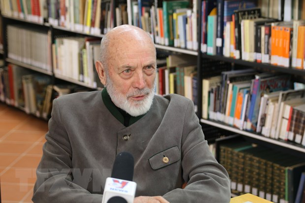 Chủ tịch danh dự của Hiệp hội INTRA Giuseppe Bearzi trả lời phỏng vấn phóng viên TTXVN về việc thành lập thư viện về Chủ tịch Hồ Chí Minh. (Ảnh: Thanh Hải-Trường Dụy/TTXVN)