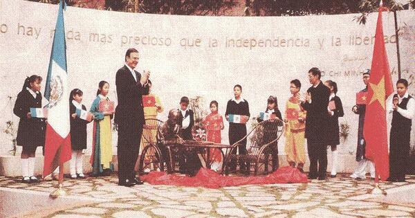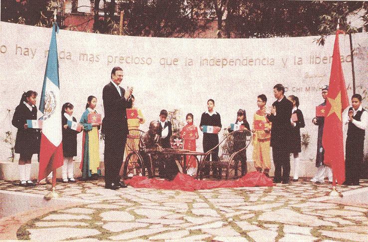 Tượng đài Chủ tịch Hồ Chí Minh đặt trong Công viên “Tự do cho các dân tộc” tại Trung tâm lịch sử củaThủ đô Mêhicô, ảnh Lễ khánh thành ngày 16/1/2009. (Nguồn: Bảo tàng Hồ Chí Minh) Với một đại dương cách trở, cái ngày 2-9 ấy đã khiến lòng chúng tôi vô cùng đau đớn vì đã mất đi một người Thầy mẫu mực. Vâng, bởi vì Hồ Chí Minh không chỉ là một vị lãnh tụ xuất chúng của dân tộc mình, một yếu nhân của quá trình phi thực dân hóa trong thế kỷ XX mà đặc biệt Người còn là một người Thầy vĩ đại trong môn học giành tự do cho các dân tộc. Là người Thầy trong nghề sư phạm giành tự do - chủ đề chính của tất cả các nền văn hóa và là mục tiêu đầu tiên của nhân loại.