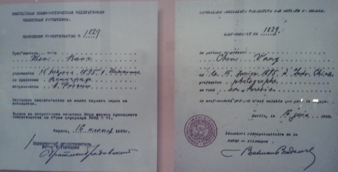 Thị thực cho phép nhập cảnh vào nước Nga, số 1829, ngày 16-06-1923, của đại diện Liên bang CHXHCN Xô Viết tại Béc-lin, Đức cấp cho Cheng Vang (Nguyễn Ái Quốc), tiếng Nga, Pháp. (Nguồn: bqllang.gov.vn)