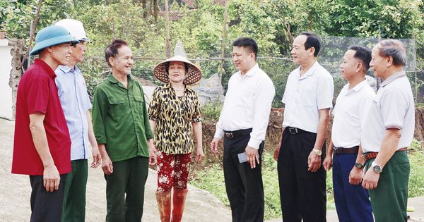 Lãnh đạo thôn Quyền, xã Hoàng Vân thăm hỏi, động viên các gia đình tự nguyện hiến đất, tháo dỡ công trình mở rộng đường giao thông. |