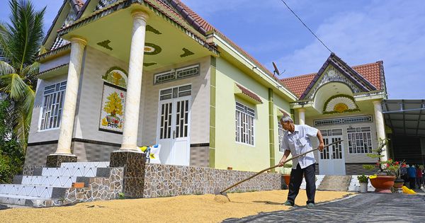 Ông Hồ Văn Tiếp phơi lúa bên cơ ngơi khang trang tại ấp Kênh 14, xã Vĩnh Thuận. Ảnh: PHẠM HIẾU