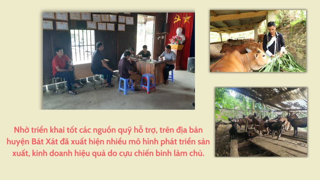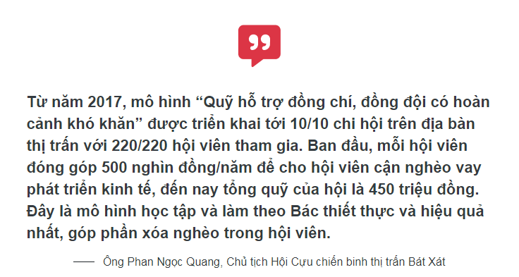 Điểm nổi bật trong học và làm theo Bác ở cựu chiến binh huyện Bát Xát là đoàn kết giúp nhau phát triển kinh tế, giảm nghèo, nâng cao đời sống hội viên. Bằng những việc làm cụ thể, các hội viên đã tạo nên nhiều mô hình phát triển sản xuất, kinh doanh hiệu quả; vận động 3 doanh nghiệp, 2 hợp tác xã, 48 trang trại, gia trại do CCB làm chủ đẩy mạnh sản xuất, kinh doanh, chuyển đổi sang giống cây trồng, vật nuôi có hiệu quả kinh tế cao, tạo nhiều việc làm cho lao động địa phương và người thân các cựu chiến binh.