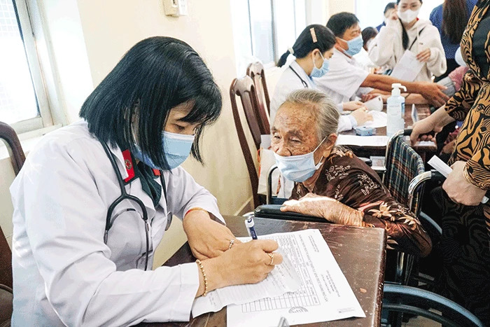 Bác sĩ BV Quân Dân y TP Cần Thơ tham gia khám bệnh cho người dân trong Tết Quân Dân năm 2025 tổ chức ở quận Bình Thủy.