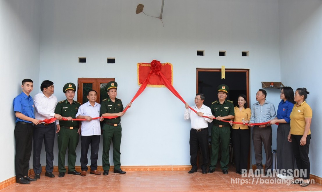 Lãnh đạo BĐBP tỉnh và các đại biểu kéo băng khánh thành nhà đại đoàn kết ở xã cho người dân ở xã Thụy Hùng, huyện Văn Lãng