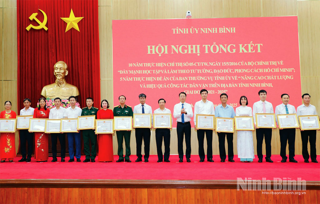 Lãnh đạo UBND tỉnh trao Bằng khen của Chủ tịch UBND tỉnh cho các tập thể có thành tích xuất sắc trong 10 năm thực hiện Chỉ thị 05-CT/TW về “Đẩy mạnh học tập và làm theo tư tưởng, đạo đức, phong cách Hồ Chí Minh”. Ảnh: Đức Lam