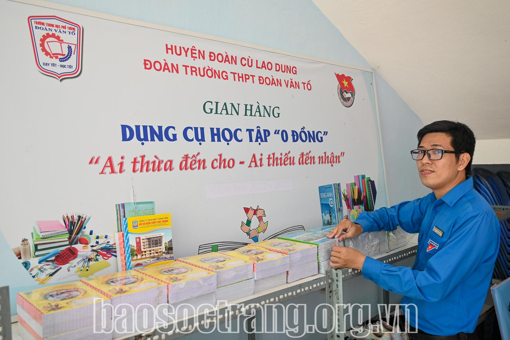 Được xây dựng từ năm 2021 và duy trì đến nay, Gian hàng dụng cụ học tập 0 đồng vận động sự đóng góp kinh phí của các mạnh thường quân, nhất là các cựu học sinh của trường để hỗ trợ dụng cụ học tập cho các em học sinh có hoàn cảnh khó khăn với tổng giá trị hỗ trợ mỗi năm trên 30 triệu đồng. Riêng trong năm học 2024 - 2025, thông qua gian hàng, Đoàn trường đã hỗ trợ 3.000 quyển tập; 20 đôi giày, dép; 10 ba lô cho các em học sinh. Ngoài ra, Đoàn trường cũng vận động được 50 suất học bổng, 5 xe đạp để hỗ trợ, tiếp sức cho các em học sinh có hoàn cảnh khó khăn được đến trường.