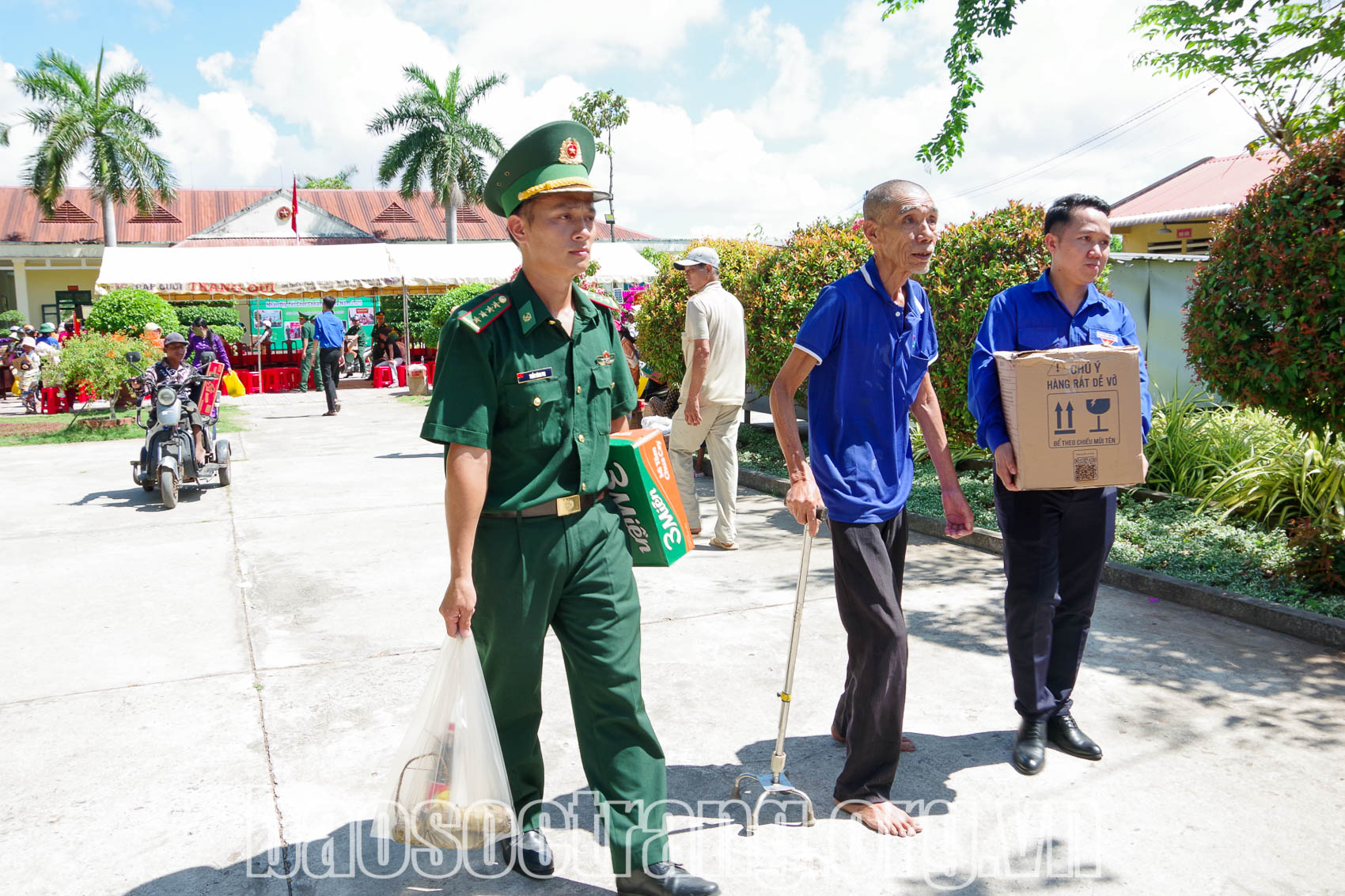 Hình ảnh đẹp của cán bộ, chiến sĩ Đồn Biên phòng Lai Hòa và đoàn viên, thanh niên xã Lai Hòa, thị xã Vĩnh Châu (Sóc Trăng) tích cực hỗ trợ người cao tuổi khi đến nhận nhu yếu phẩm tại “Gian hàng 0 đồng dành cho người nghèo”. Ảnh: SONG LÊ