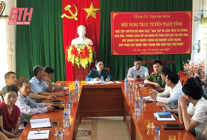 Cán bộ, đảng viên xã Cát Tân, huyện Như Xuân học tập chuyên đề năm 2023 “Học tập và làm theo tư tưởng, đạo đức, phong cách Hồ Chí Minh về giá trị văn hóa, sức mạnh con người trong sự nghiệp cách mạng, góp phần xây dựng tỉnh Thanh Hóa giàu đẹp, văn minh” bằng hình thức trực tuyến.