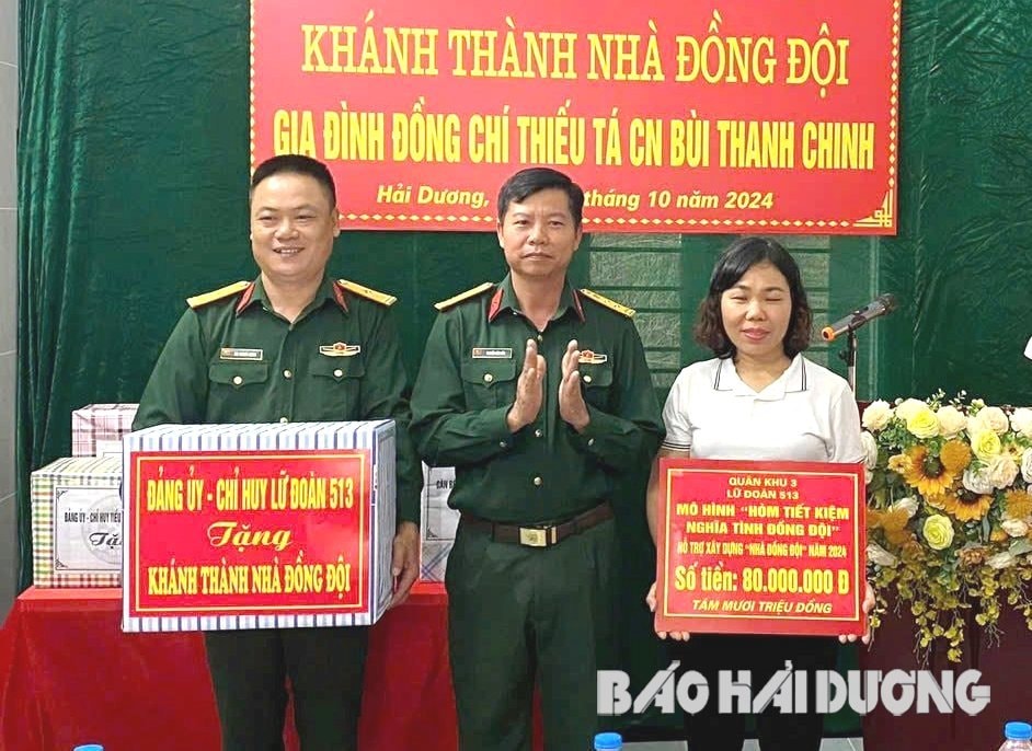 Lãnh đạo Lữ đoàn 513 trao biểu trưng hỗ trợ xây nhà đồng đội từ mô hình "Hòm tiết kiệm vì nghĩa tình đồng đội" cho gia đình quân nhân trong đơn vị (ảnh cơ sở cung cấp)