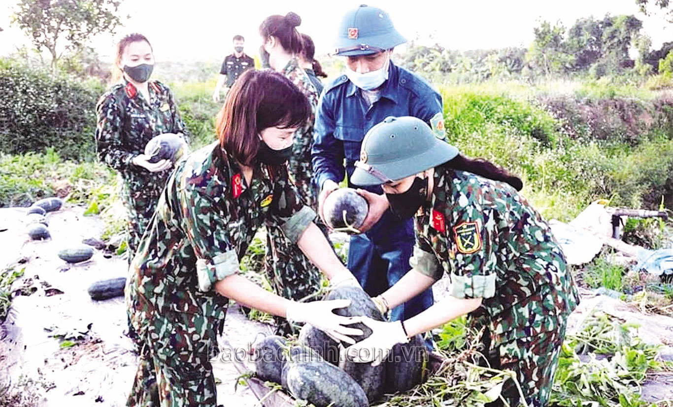 Cán bộ, hội viên phụ nữ Bộ CHQS tỉnh thu hoạch nông sản giúp nhân dân xã Cao Đức (huyện Gia Bình).