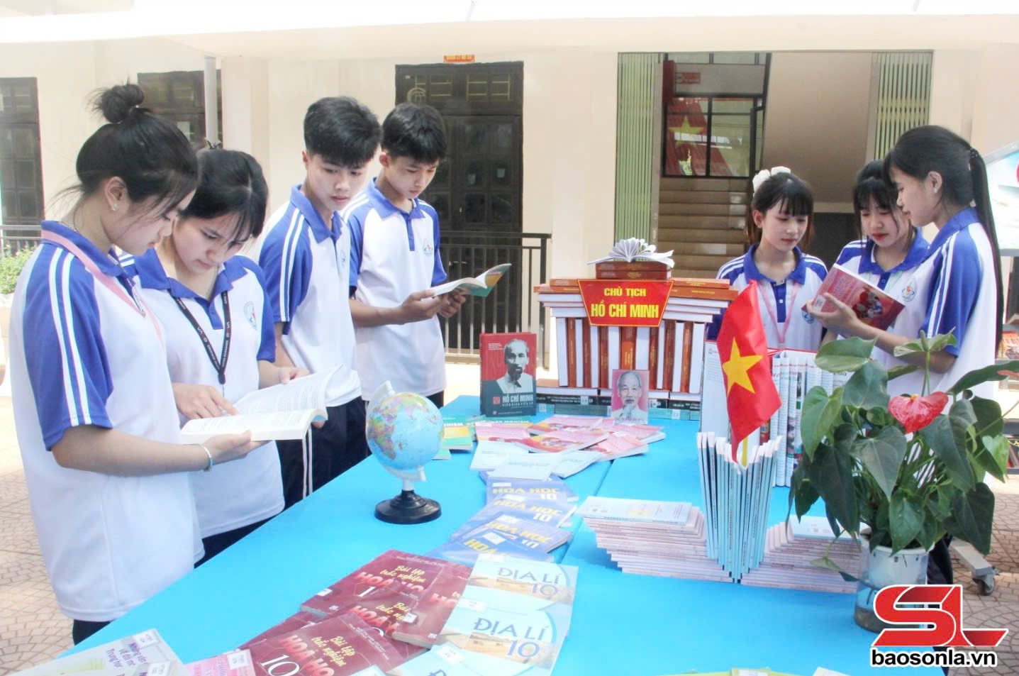 Học sinh Trường THPT Yên Châu tìm hiểu tư liệu sách, ảnh về Bác Hồ.