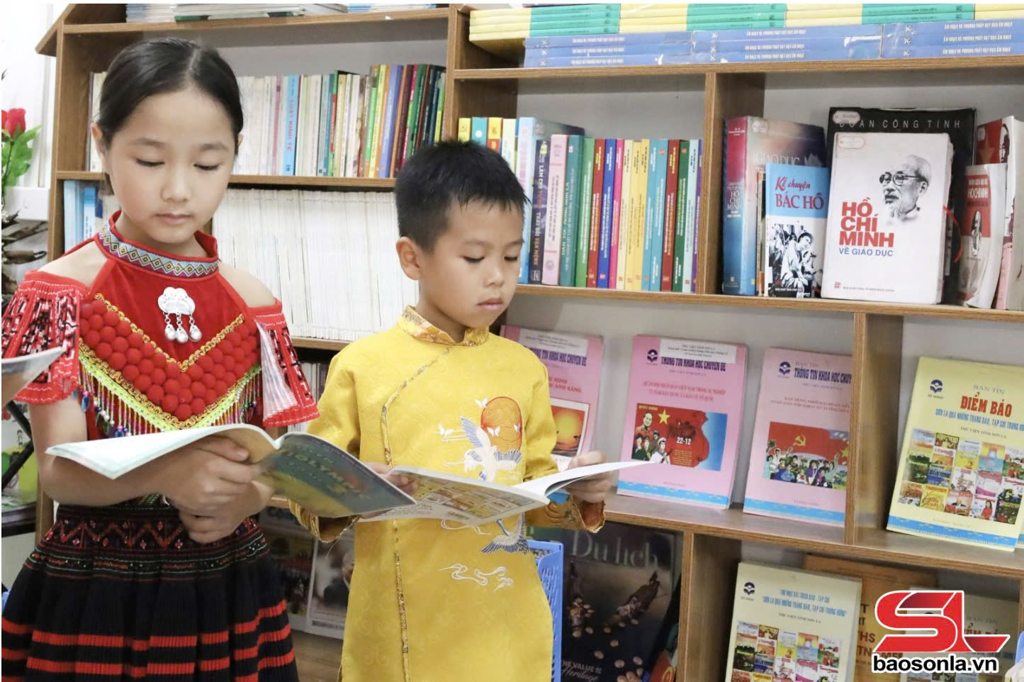 Học sinh Trường Tiểu học - THCS Liên Chung, xã Phiêng Khoài, huyện Yên Châu đọc những cuốn sách viết về Bác.
