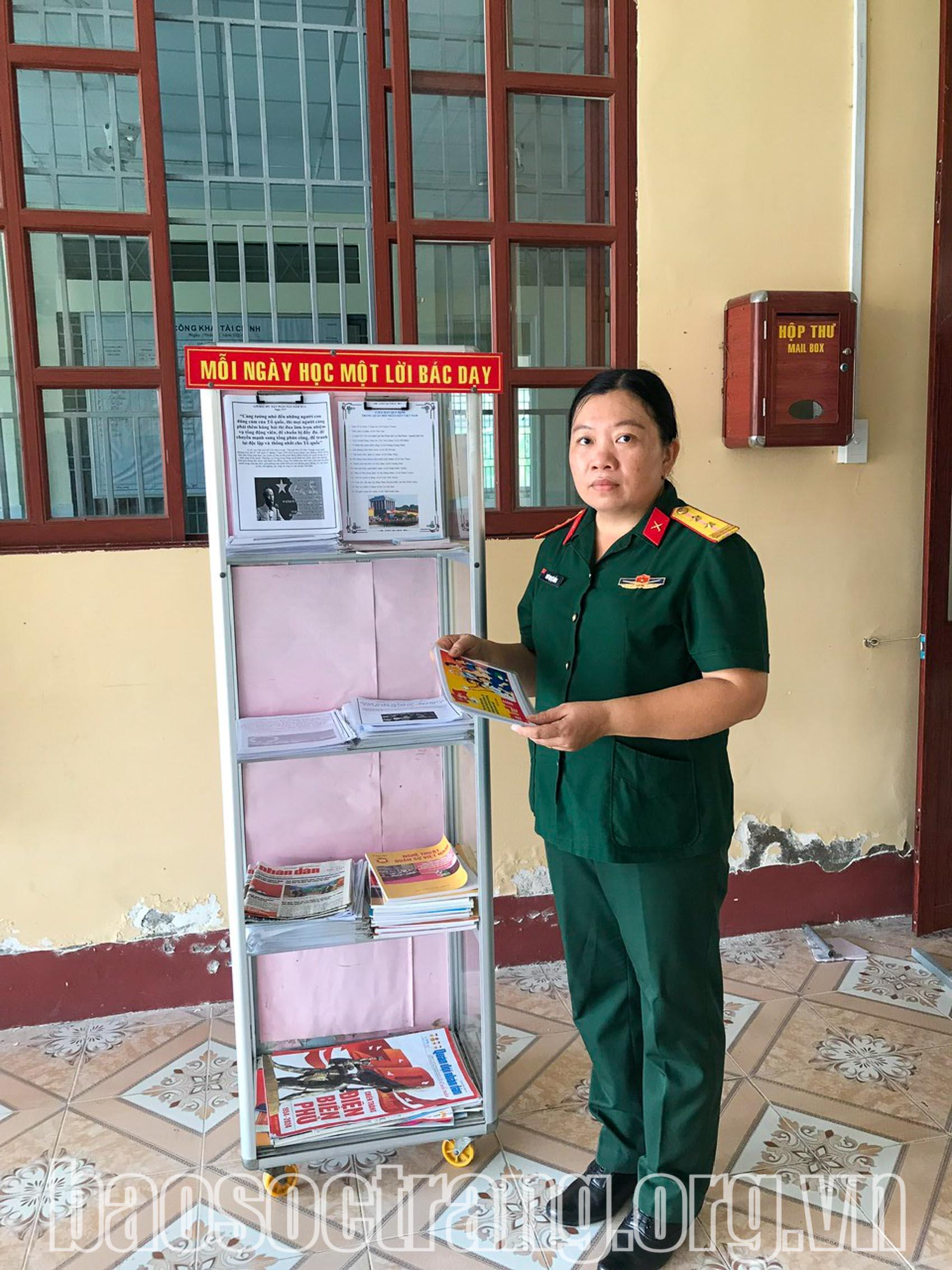 Để giúp cho cán bộ, chiến sĩ trong đơn vị có thêm nhiều tư liệu, Trung tá Ngô Thị Lệ Hằng đã nghiên cứu, đề xuất thực hiện tủ sách tuyên truyền theo nội dung "Mỗi ngày một lời Bác dạy” để cán bộ, chiến sĩ có thể xem trong giờ nghỉ, ngày nghỉ, cũng như phục vụ trong các lớp huấn luyện dân quân tự vệ. Trung tá Ngô Thị Lệ Hằng còn sưu tầm một số phim tư liệu về Bác Hồ, về Đại tướng Võ Nguyên Giáp và tham mưu thủ trưởng đơn vị chỉ đạo vào ngày 19 hằng tháng tổ chức chiếu cho cán bộ, chiến sĩ xem. Qua đó giúp cho cán bộ, chiến sĩ phát huy tinh thần yêu nước, tự hào về truyền thống anh hùng quân đội, của lực lượng vũ trang để tự giác tu dưỡng, rèn luyện trong công tác. “Để đáp ứng nhu cầu nâng cao đời sống văn hóa tinh thần, giúp cho cán bộ, chiến sĩ có điều kiện thuộc lời, nội dung và biết hát các bài hát truyền thống, tôi đã sưu tầm 15 bài hát quy định trong quân đội, mỗi buổi sáng (trước giờ đọc báo sáng) sẽ tổ chức cho cán bộ, chiến sĩ nghe 1 bài trong 15 bài hát. Qua thời gian triển khai thực hiện, đến nay có rất nhiều cán bộ, chiến sĩ thuộc được các bài hát quy định, đã tạo thêm không khí phấn khởi, có niềm tin, sức mạnh tinh thần, quyết tâm khắc phục mọi khó khăn, hoàn thành tốt mọi nhiệm vụ được giao”, Trung tá Lệ Hằng chia sẻ.