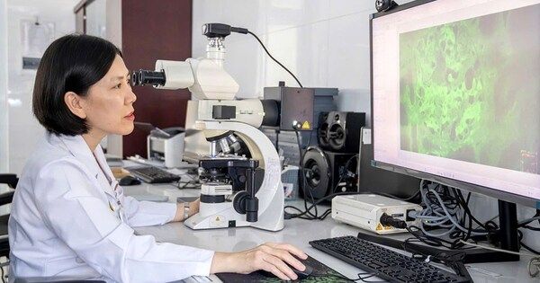 | Trung tá, TS Nguyễn Thùy Linh đọc tiêu bản nhuộm miễn dịch huỳnh quang trực tiếp mẫu sinh thiết thận chẩn đoán các bệnh lý thận nội khoa và thận ghép. |