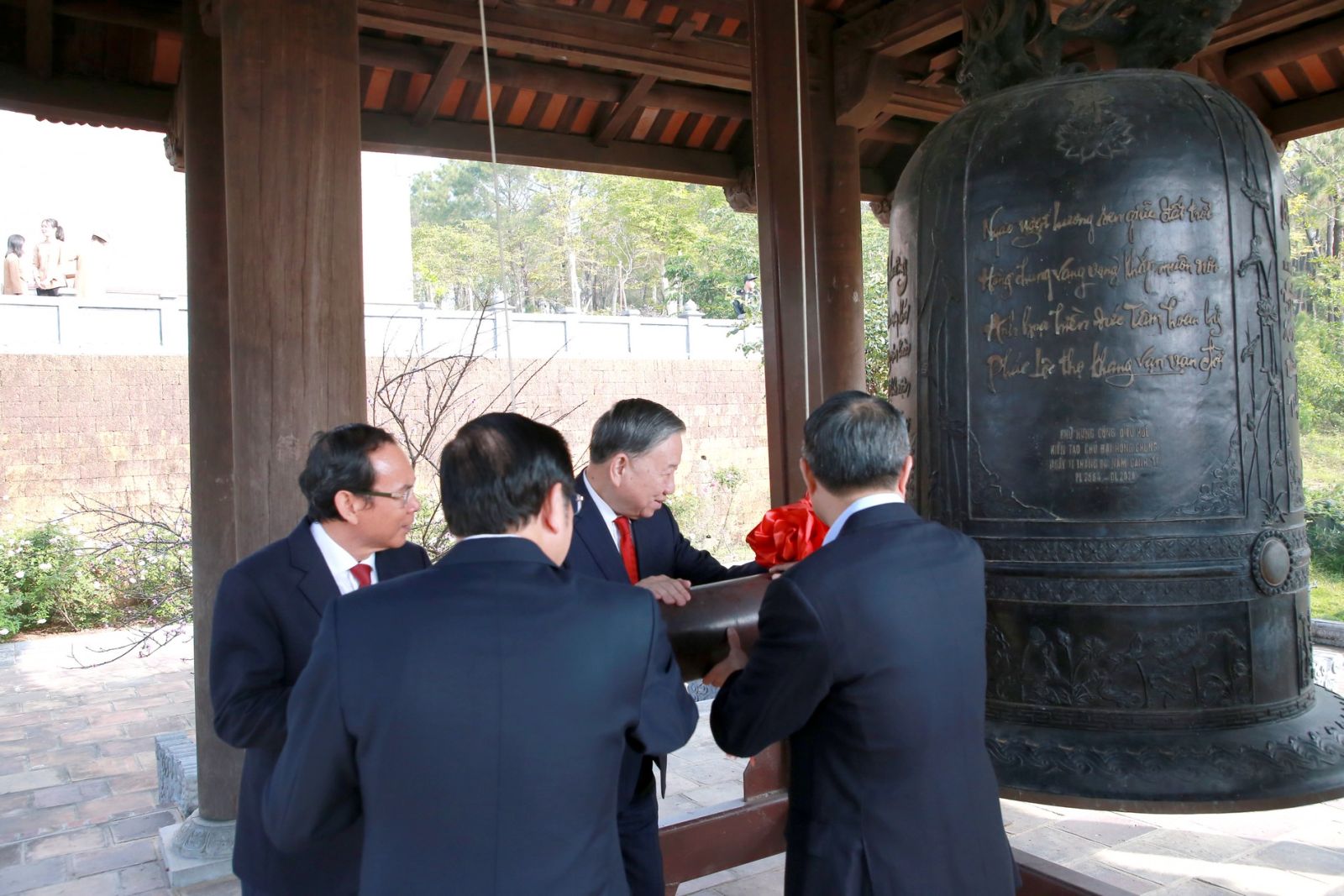 Tổng Bí thư Tô Lâm và các đồng chí lãnh đạo thỉnh chuông tại Đền Chung Sơn - Đền thờ Gia tiên Bác Hồ.
