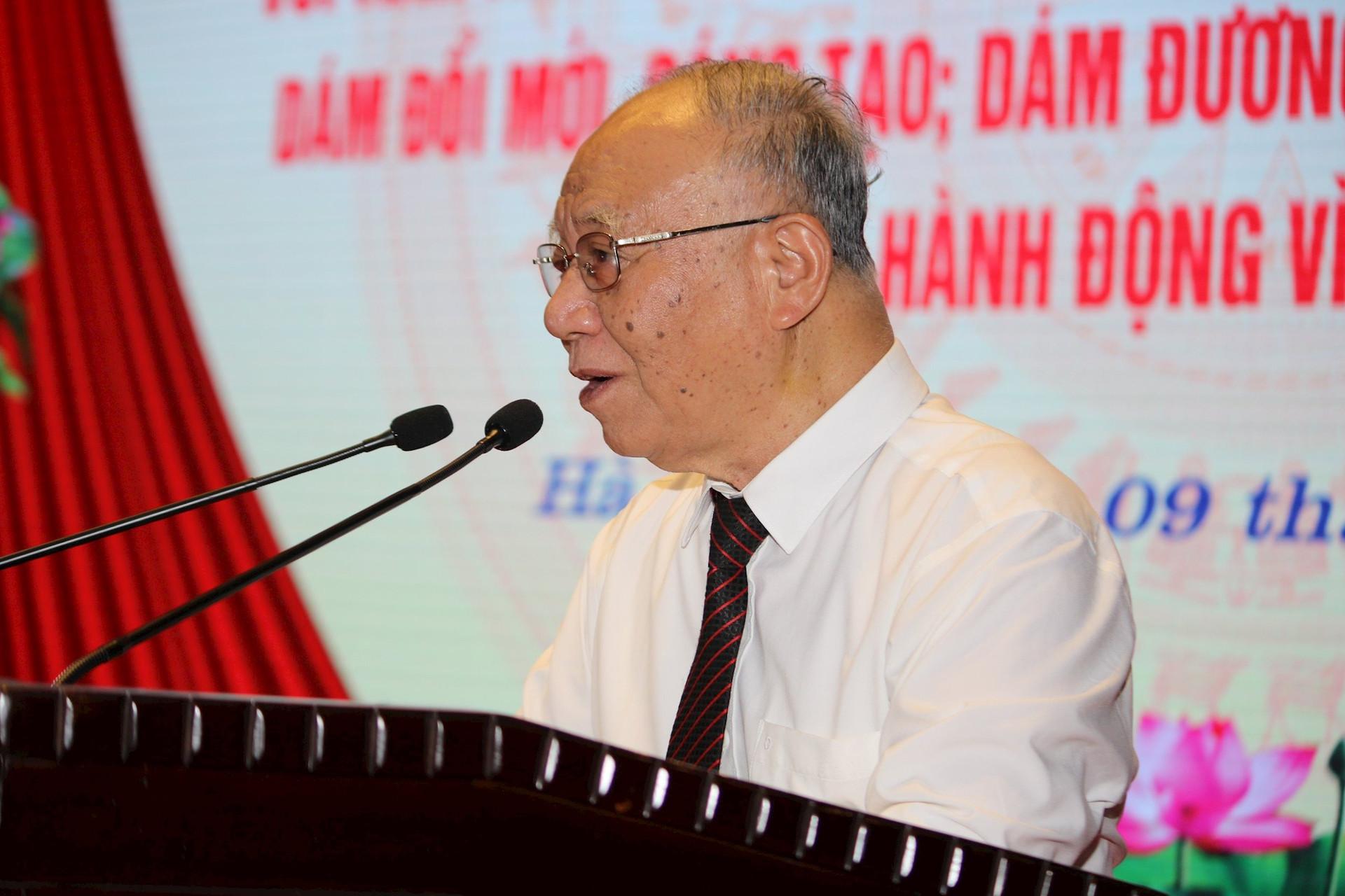 Giáo sư, Tiến sĩ Hoàng Chí Bảo, nguyên Ủy viên Hội đồng Lý luận Trung ương truyền đạt chuyên đề tại hội nghị. Ảnh: Hiền Phương.