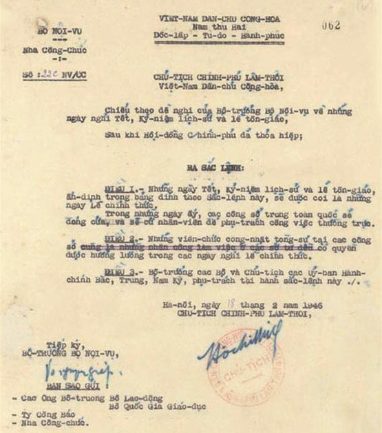 Sắc lệnh số 22c NV/CC ngày 18/2/1946 quy định ngày 1/5 là một trong những ngày