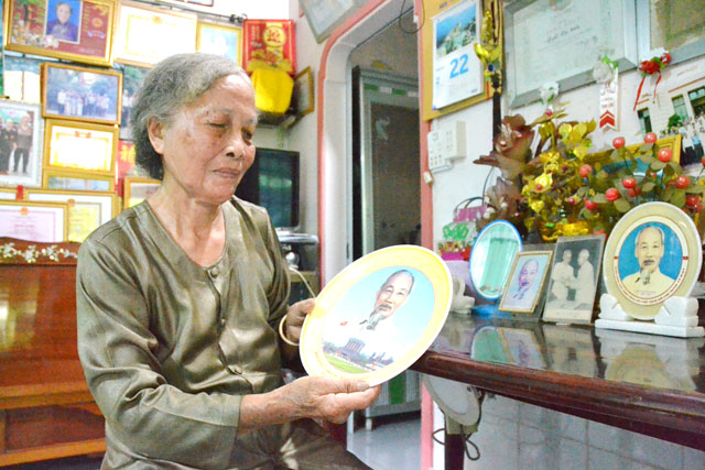 Cô Nguyễn Thị Châu bên bức ảnh Bác Hồ được bài trí trên bàn thờ giữa nhà