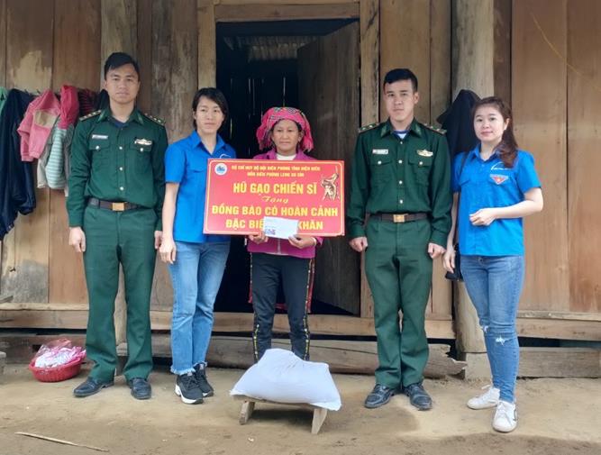 Cán bộ Đồn Biên phòng Leng Su Sìn trao tặng gạo từ mô hình “Hũ gạo chiến sĩ” cho người dân có hoàn cảnh khó khăn trên địa bàn. Ảnh: Anh Dũng