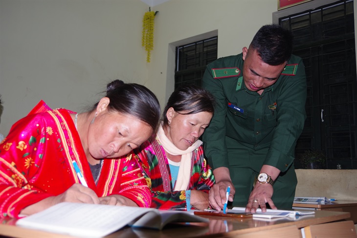Cán bộ Đồn Biên phòng Si Pha Phìn tham gia lớp xóa mù chữ tại xã Phìn Hồ, huyện Nậm Pồ, tỉnh Điện Biên. Ảnh: Anh Dũng
