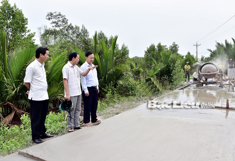 Lãnh đạo Huyện ủy, UBND huyện Đông Hải kiểm tra tiến độ thi công lộ giao thông nông thôn do Nhà nước và Nhân dân cùng làm tại xã Định Thành A (huyện Đông Hải). (Ảnh: H.T)