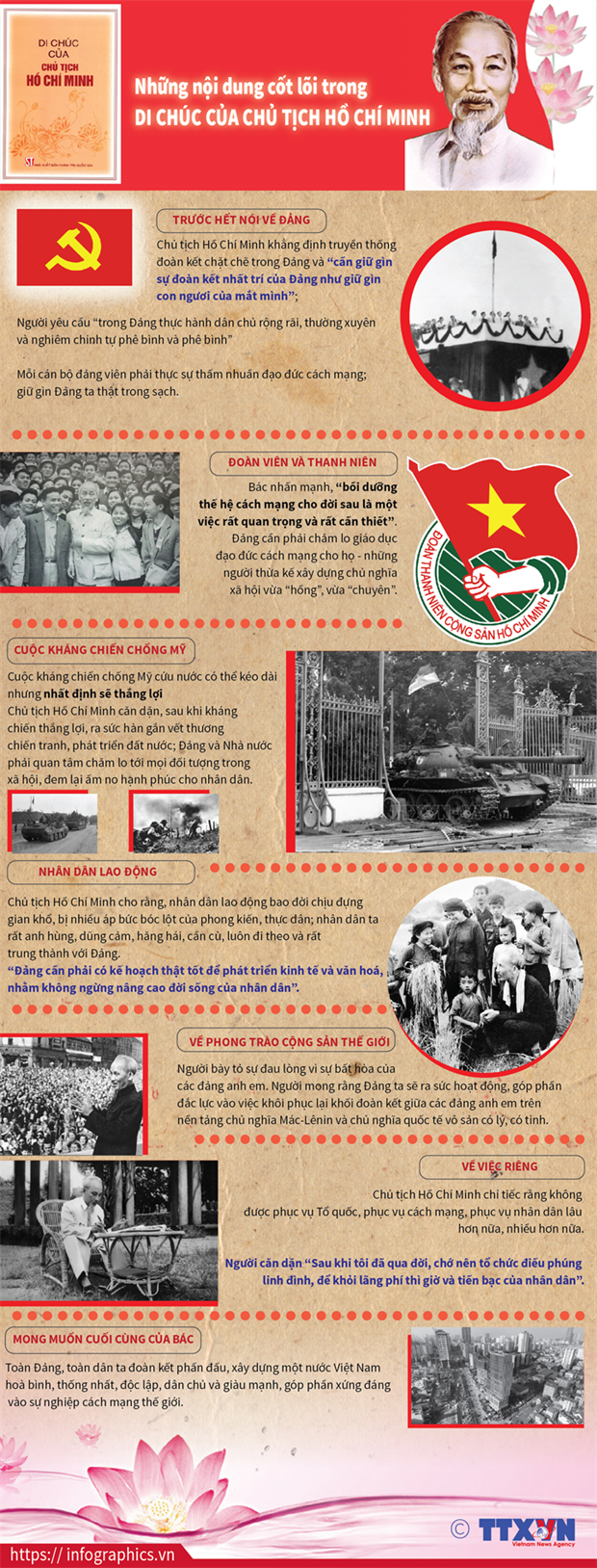 Di chúc là những lời căn dặn tâm huyết, toát lên khí phách, tinh thần lạc quan chiến thắng của một bậc “đại trí, đại nhân, đại dũng,” là sự kết tinh tư tưởng, đạo đức, phong cách, tâm hồn cao đẹp của vị lãnh tụ suốt đời phấn đấu hy sinh vì Tổ quốc, vì nhân dân và nhân loại.