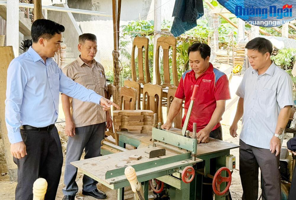 Bí thư Huyện ủy Minh Long Nguyễn Mạnh Thái (bên trái) thăm cơ sở sản xuất mộc của anh Đinh Văn Mót, ở xã Thanh An (Minh Long).