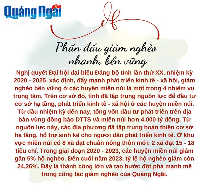 Với việc triển khai đồng bộ các giải pháp, trong 5 năm (2019 - 2024), tỷ lệ hộ nghèo của huyện Ba Tơ giảm từ 4,5- 6%/năm. Đến đầu năm 2024, tỷ lệ hộ nghèo giảm còn 23,5%, huyện Ba Tơ phấn đấu đến cuối năm 2024, tỷ lệ hộ nghèo giảm xuống còn 17%.