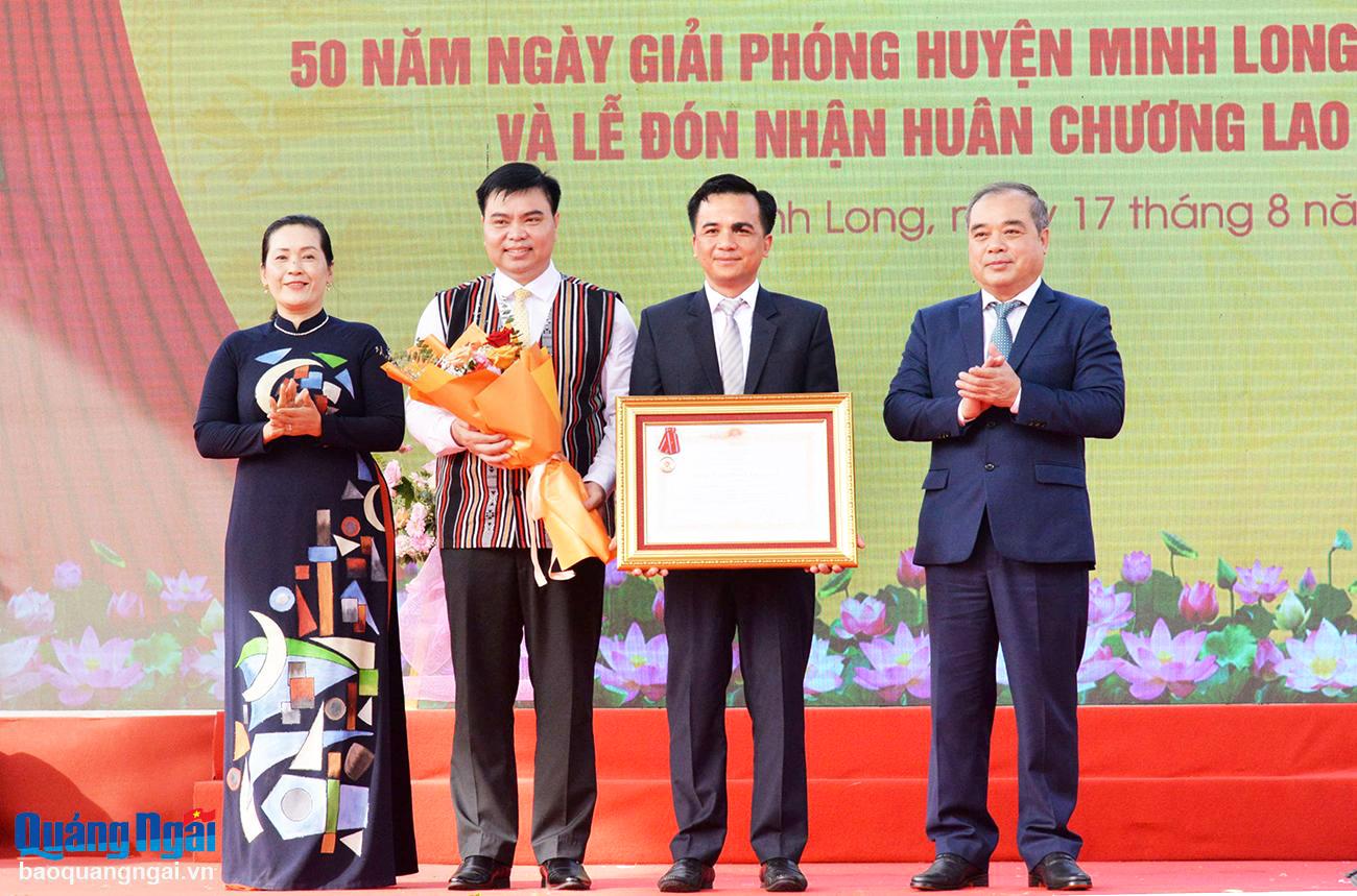 Thừa ủy quyền của Chủ tịch nước, Phó Bí thư Tỉnh ủy Đinh Thị Hồng Minh và Phó Chủ tịch Thường trực UBND tỉnh Trần Hoàng Tuấn trao Huân chương Lao động hạng Ba cho lãnh đạo huyện Minh Long.