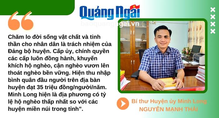 "Chăm lo đời sống vật chất và tinh thần cho nhân dân là trách nhiệm của Đảng bộ huyện. Cấp ủy, chính quyền các cấp luôn đồng hành, khuyến khích hộ nghèo, cận nghèo vươn lên thoát nghèo bền vững. Hiện thu nhập bình quân đầu người trên địa bàn huyện đạt 35 triệu đồng/người/năm. Minh Long hiện là địa phương có tỷ lệ hộ nghèo thấp nhất so với các huyện miền núi trong tỉnh”, Bí thư Huyện ủy Minh Long Nguyễn Mạnh Thái nhấn mạnh.