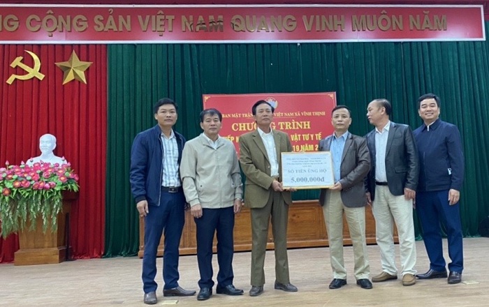 Ông Đỗ Văn Ngưỡng (thứ 3 từ trái sang) trao tiền ủng hộ Quỹ phòng, chống Covit-19 cho xã Vĩnh Thịnh