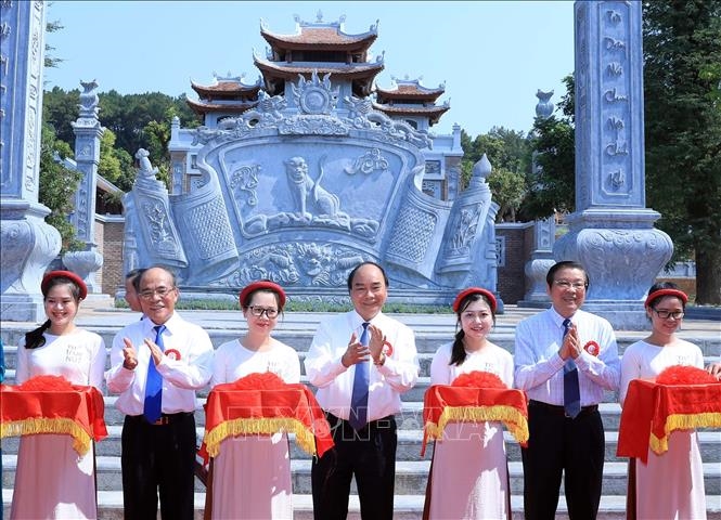 Thủ tướng Nguyễn Xuân Phúc, nguyên Chủ tịch Quốc hội Nguyễn Sinh Hùng, Trưởng Ban Nội chính Trung ương Phan Đình Trạc khánh thành Đền Chung Sơn, thờ gia tiên Chủ tịch Hồ Chí Minh. (Ảnh: Thống Nhất – TTXVN)