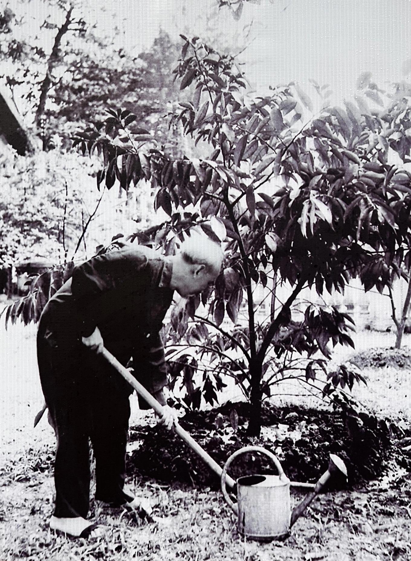 Chủ tịch Hồ Chí Minh chăm sóc cây vú sữa mà đồng bào miền Nam tặng, trồng ở Khu di tích tại Phủ Chủ tịch. Ảnh tư liệu