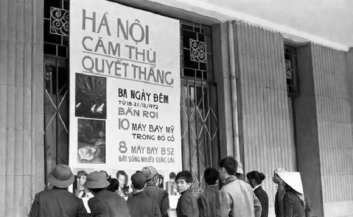 Người dân Thủ đô theo dõi tin chiến thắng qua bảng thông tin trong những ngày Mỹ đánh phá ác liệt cuối tháng 12/1972. (Ảnh: TTXVN).