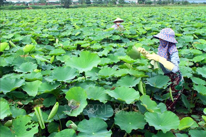 Người dân xã Kim Liên chuyển đổi ruộng lúa thấp trũng năng suất thấp sang trồng sen mang lại hiệu quả kinh tế cao (Ảnh: Tá Chuyên/TTXVN)