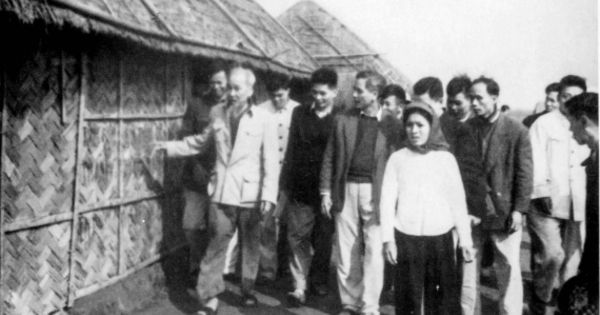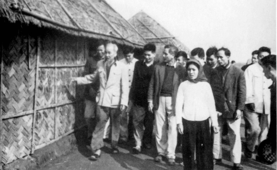 Chủ tịch Hồ Chí Minh thăm một xóm của bà con nông dân Hợp tác xã Nam Cường, mới thành lập do lấn biển khai hoang, ngày 26/3/1962. Ảnh tư liệu