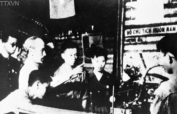 Hồ Chủ tịch thăm một xưởng công binh tại căn cứ Việt Bắc trong những năm kháng chiến chống thực dân Pháp