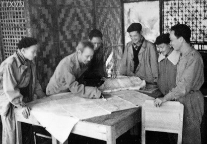 Chủ tịch Hồ Chí Minh và các đồng chí trong Ban Thường vụ Trung ương Đảng họp quyết định mở Chiến cuộc Đông Xuân 1953-1954 và Chiến dịch Điện Biên Phủ (xã Phú Đình, huyện Định Hóa, tỉnh Thái Nguyên cuối năm 1953)