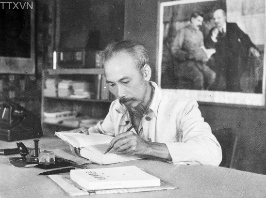 Chủ tịch Hồ Chí Minh trong phòng làm việc của Người tại căn cứ địa Việt Bắc (1951)