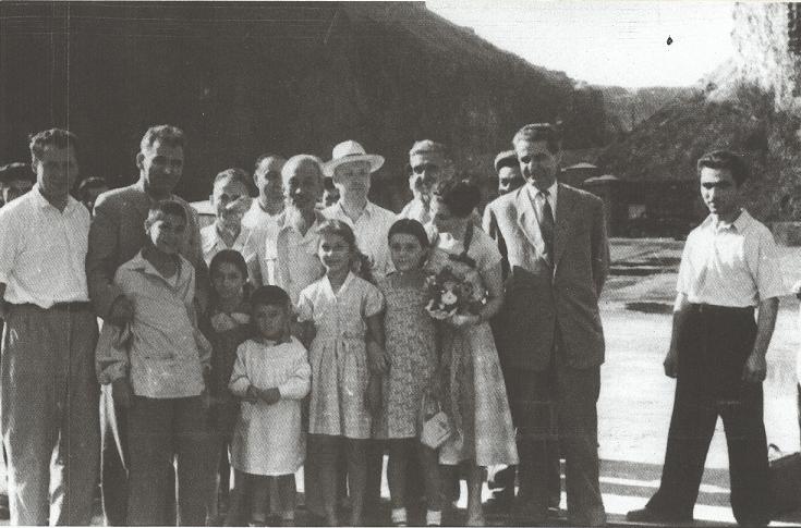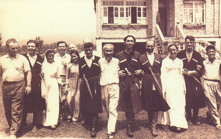 Chủ tịch Hồ Chí Minh với cán bộ và các cháu thiếu nhi nhà máy thủy điện ở Ácmênia, trong chuyến đi thăm và nghỉ tại Liên Xô, ngày 22/7/1959. (Nguồn: Tài liệu lưu trữ Bộ Ngoại giao)