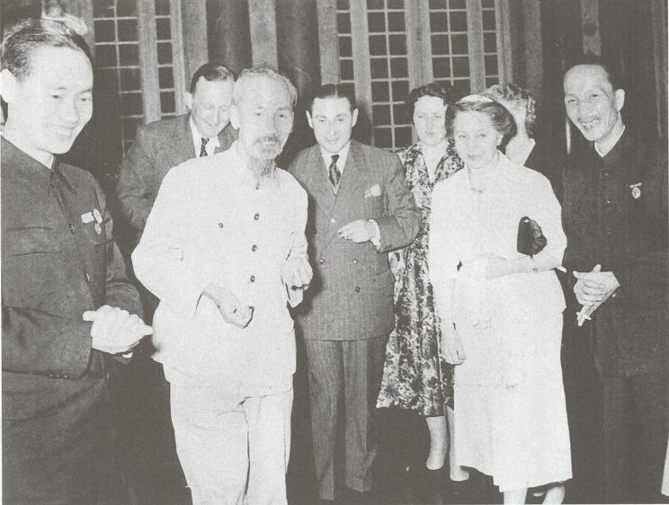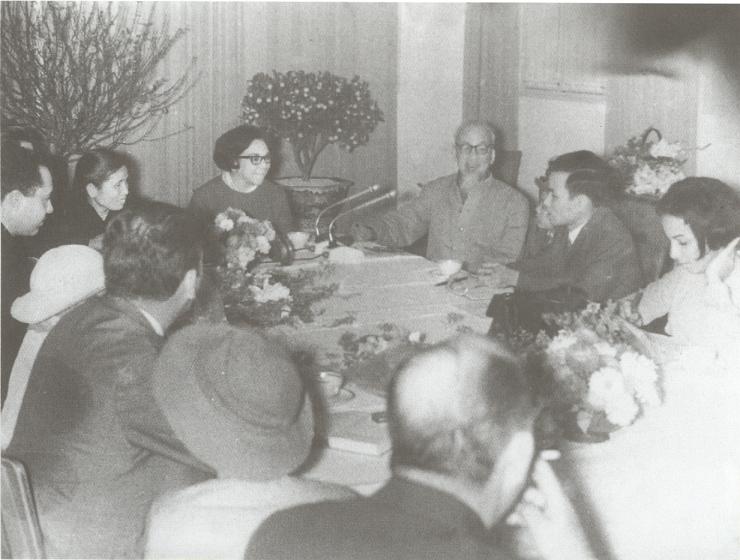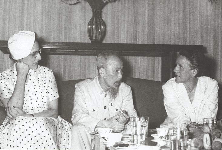 Hồ Chủ tịch tiếp đoàn đại biểu phụ nữ hòa bình Pháp tại Phủ Chủ tịch, tháng 5/1955. (Nguồn: Khu di tích Hồ Chí Minh tại Phủ Chủ tịch)