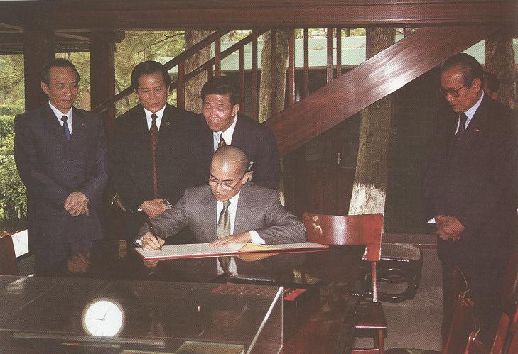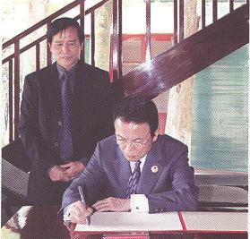 Bộ trưởng Bộ Ngoại giao Nhật Bản Taro Aso lưu bút tại Khu di tích Hồ Chí Minh tại Phủ Chủ tịch, ngày 17/11/2006. (Nguồn: Khu di tích Hồ Chí Minh tại Phủ Chủ tịch)