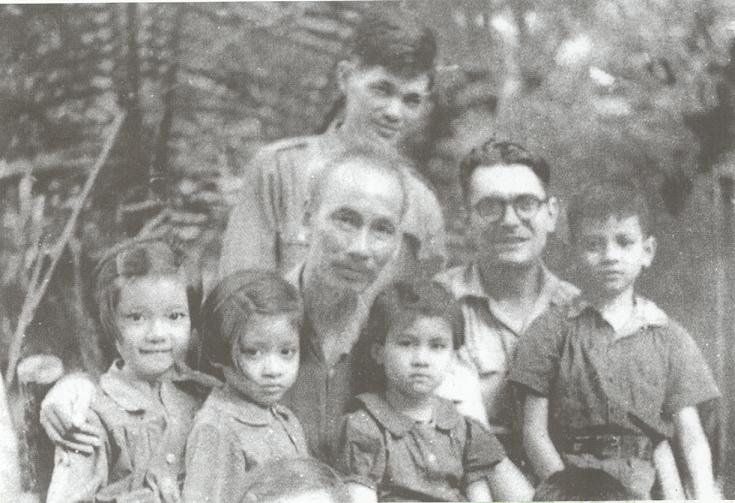 Chủ tịch Hồ Chí Minh và các cháu thiếu nhi chụp ảnh chung với đại biểu Đảng Cộng sản Pháp, phóng viên Leo Figere tại Chiến khu Việt Bắc, tháng 9/1950. (Nguồn: Khu di tích Hồ Chí Minh tại Phủ Chủ tịch)