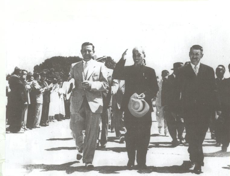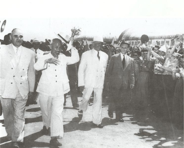 Chủ tịch Hồ Chí Minh thăm Anbani, các đồng chí lãnh đạo Đảng và Nhà nước Anbani đón người tại sân bay Tirana, tháng 8/1957. (Nguồn: Tài liệu lưu trữ Bộ Ngoại giao)